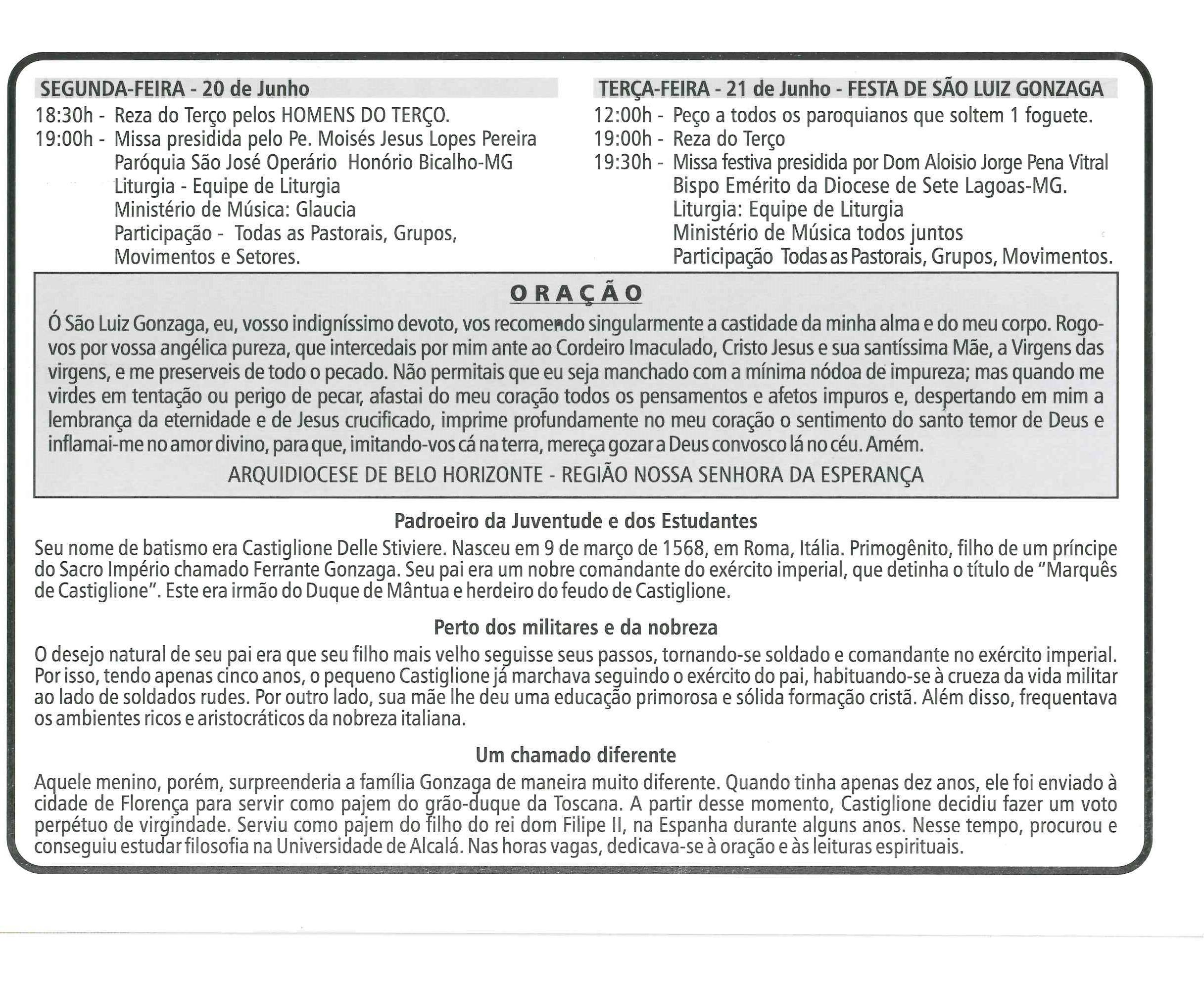 Endereço da Paróquia São Luiz Gonzaga: Rua Professor Tito Novaes, 709 – Minas Brasil