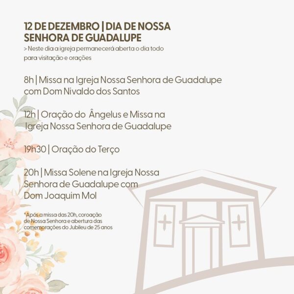 No dia 12 de dezembro, Grande Festa da Padroeira, dom Nivaldo dos Santos, bispo auxiliar da Arquidiocese de Belo Horizonte e referencial da Região Episcopal Nossa Senhora Aparecida (Rensa), preside Eucaristia, às 8h, na Paróquia N. S. de Guadalupe. A Santa Missa das 20h terá a presidência de dom Joaquim Mol, bispo auxiliar da Arquidiocese de Belo Horizonte e referencial da Região Episcopal Nossa Senhora da Esperança (Rense).