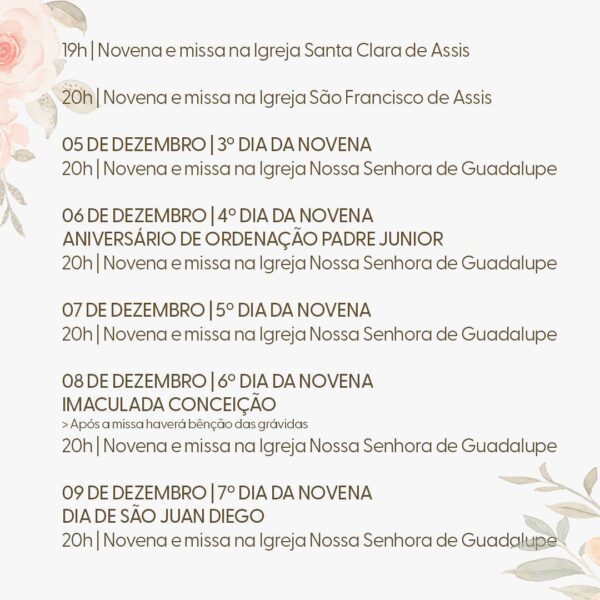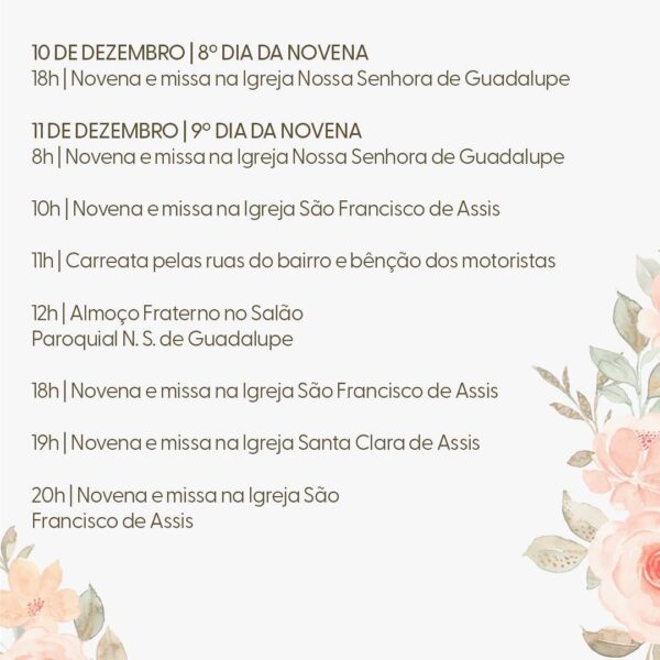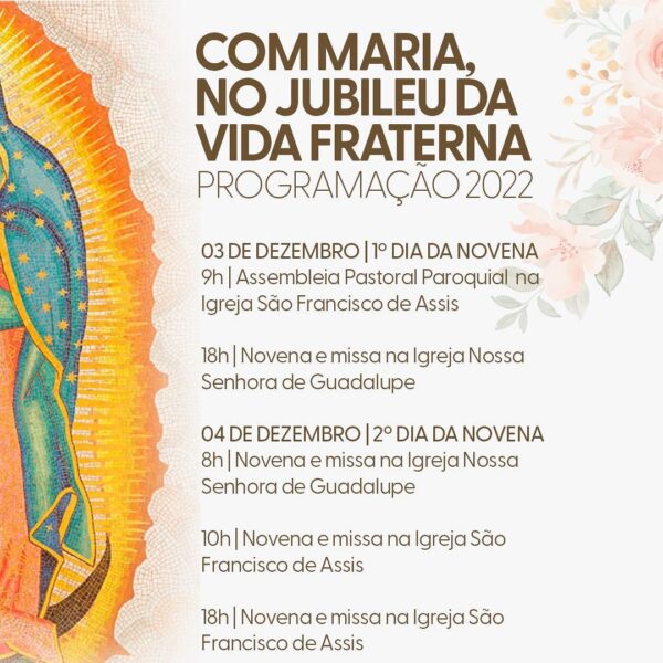 Inspirada pelo tema “Com Maria, no jubileu da vida fraterna”, a Novena e as Missas ocorrem na Paróquia de Nossa Senhora de Guadalupe, no bairro Castelo, e também nas Comunidades São Francisco de Assis e Santa Clara de Assis.