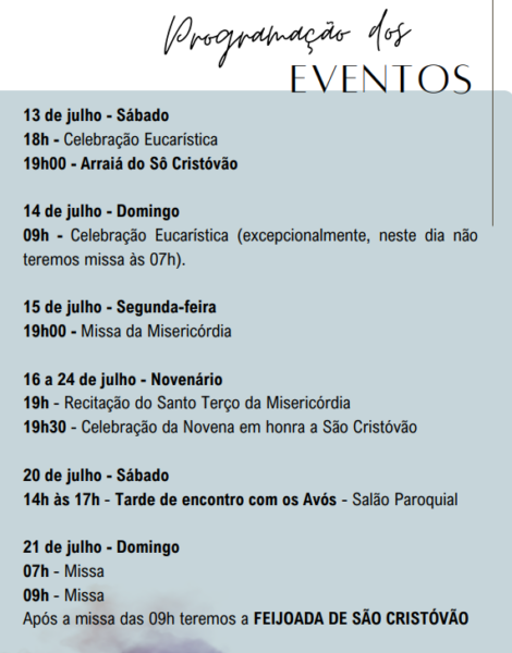 De 16 a 25 de julho, fiéis celebram a 74ª Festa em Honra a São Cristóvão, na Paróquia São Cristóvão – Belo Horizonte, com o tema “Para que todos sejam um”.