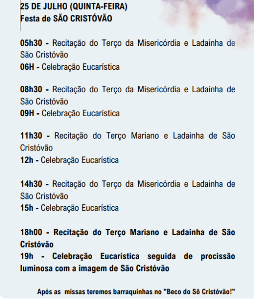 A programação especial para celebrar o Dia de São Cristóvão, padroeiro dos motoristas, conta com Missas, Novenas e oração do Terço da Misericórdia.