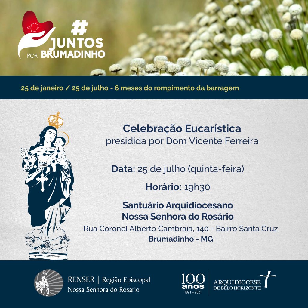 No dia 25 de julho, 6 meses após o rompimento da barragem de rejeitos em Brumadinho, dom Vicente preside Missa no Santuário Arquidiocesano Nossa Senhora do Rosário, às 19h30, na Rua Coronel Alberto Cambraia, 140 – Bairro Santa Cruz, em intenção às vítimas e familiares.