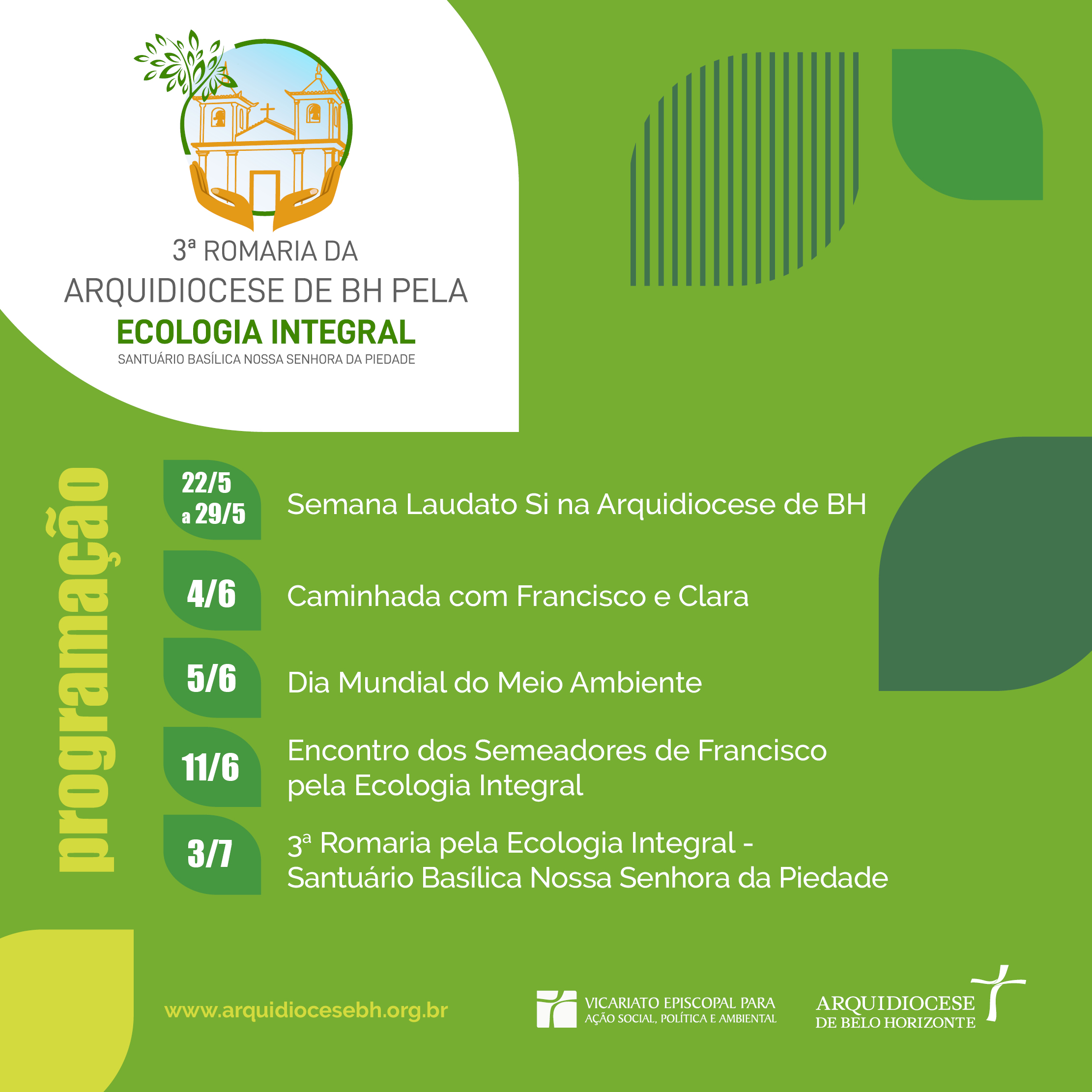 A 3ª Romaria da Arquidiocese de Belo Horizonte pela Ecologia Integral inicia, no dia 22 de maio, a Semana Laudato Si’ que será vivenciada nas comunidades de fé, até domingo, 29 de maio. Na encíclica Laudato Si’ o Papa Francisco faz importantes indicações sobre os cuidados com a casa comum.