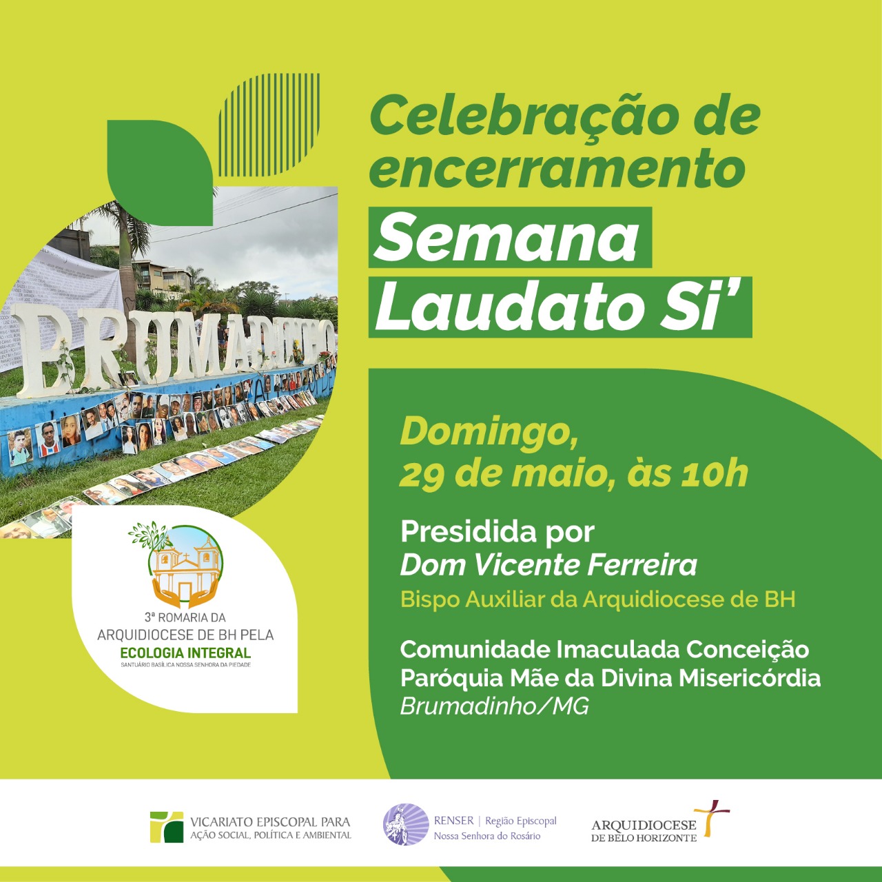 No domingo, 29 de maio, às 10h, a Semana Laudato Si’ terá transmissão mundial de sua Celebração de encerramento, presidida por dom Vicente Ferreira, bispo auxiliar da Arquidiocese de Belo Horizonte e referencial para a Região Episcopal Nossa Senhora do Rosário (Renser). A Santa Missa será celebrada na Paróquia Mãe da Divina Misericórdia, em Brumadinho.