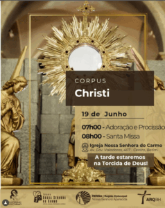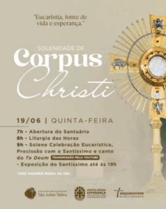 No dia 19 de junho – Festa de Corpus Christi – após a Celebração Eucarística das 11h, fiéis seguem em procissão no entorno da Igreja. Em seguida, a comunidade de fé é convidada a celebrar, em comunhão, o Santíssimo Sacramento do Corpo e do Sangue de Cristo na Torcida de Deus, rezando juntos na Santa Missa presidia por dom Walmor Oliveira de Azevedo, às 17h15, no estádio Mineirão.