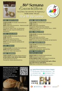 O Santuário Arquidiocesano da Santíssima Eucaristia – Paróquia Nossa Senhora da Boa Viagem celebra a 86ª Semana Eucarística, com o tema “Eucaristia: Sacramento de Esperança”, entre os dias 12 e 19 de junho. O evento faz parte da programação especial da Festa de Corpus Christi, celebrada este ano pela Igreja no dia 19.
