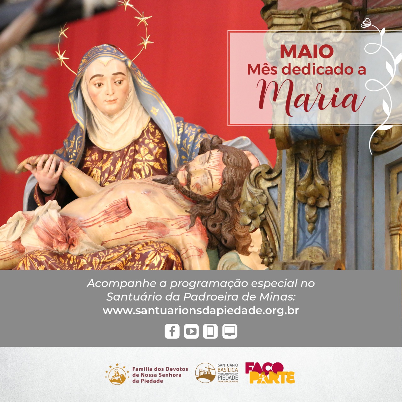 O mês de maio é dedicado à Santíssima Virgem Maria, Mãe de Jesus e da Igreja. Em Minas Gerais, os fiéis dedicam orações especialmente a Nossa Senhora da Piedade, Padroeira de Todos os mineiros.