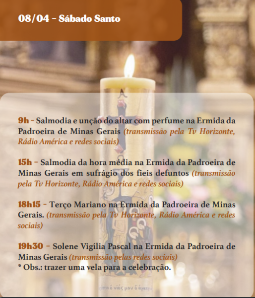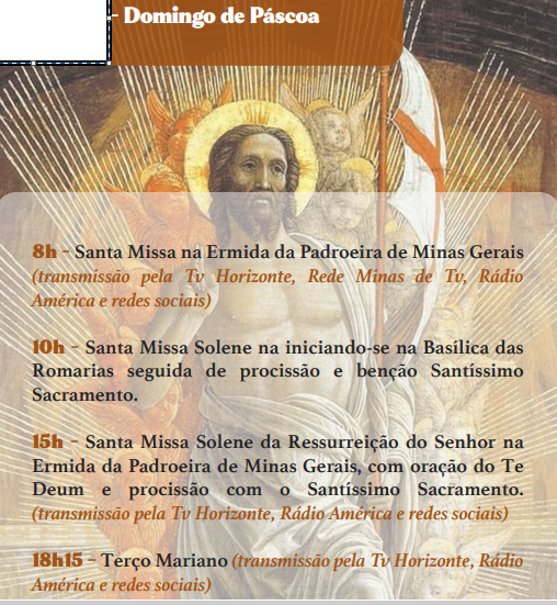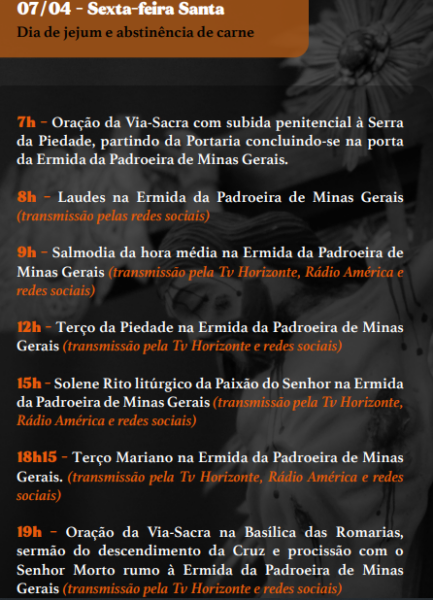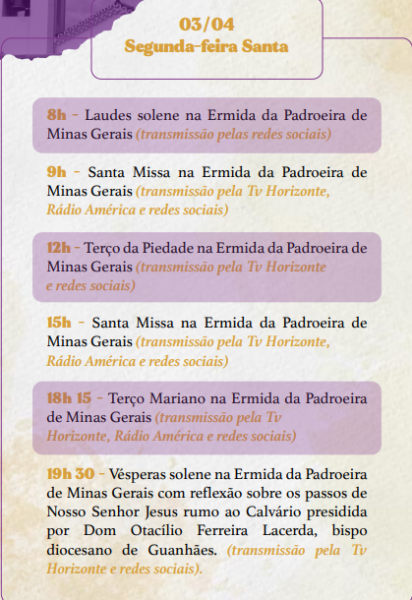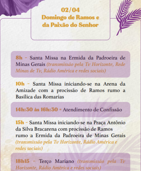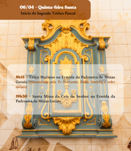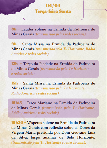 O Santuário Basílica Nossa Senhora da Piedade – Padroeira de Minas Gerais acolhe peregrinos para a vivência da Semana Santa – de 2 a 9 e abril. O peregrino está especialmente convidado a vivenciar momentos de oração, espiritualidade e contemplação no Santuário da Mãe Piedade.