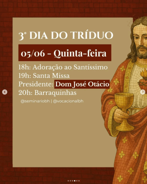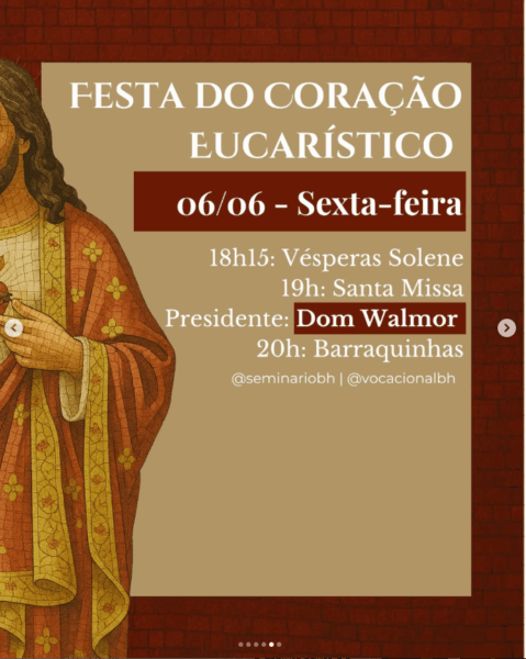 No dia 6 de junho, nosso arcebispo, dom Walmor, preside a Santa Missa Solene em honra ao Coração Eucarístico de Jesus, às 19h, no Convivium Emaús, sede do Sacej. Convide sua família e amigos e participe conosco desse momento tão especial.?