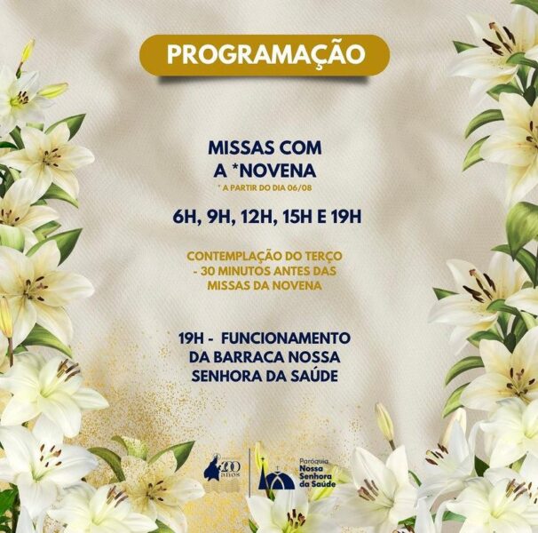 No dia da Padroeira, 15 de agosto, haverá missas ao longo de todo o dia, com alvorada festiva, cavalgada em honra à Nossa Senhora da Saúde e procissão luminosa.