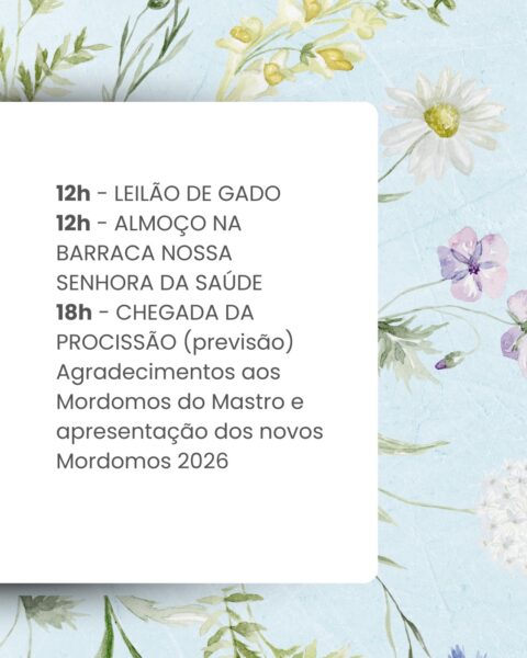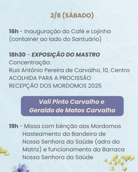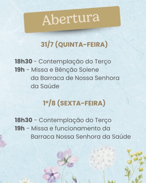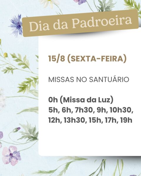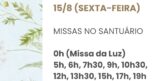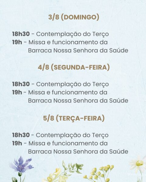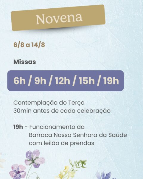 No dia da Festa de Nossa Senhora da Saúde, 15 de agosto, sexta-feira, as Missas serão celebradas às 0h (Missa da Luz), 5h, 6h, 7h30, 9h, 10h30, 12h, 13h30, 15h, 17h e às 19h. Clique aqui e baixe o novenário do Jubileu!