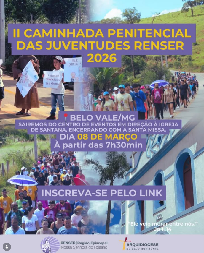 Nesta Quaresma, jovens da Região Episcopal Nossa Senhora do Rosário (Renser) são convidados para a 2ª Caminhada Penitencial das Juventudes 2026. O encontro será no dia 8 de março, domingo, a partir das 7h30, em Belo Vale.