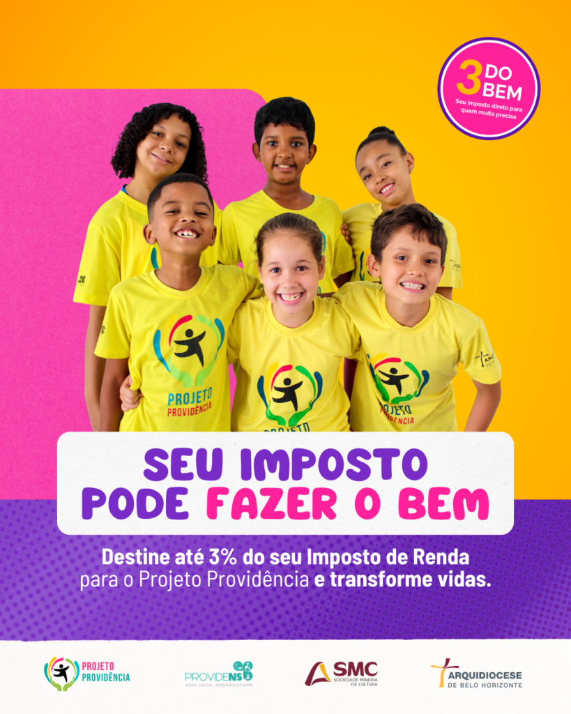 Participe do 3 do Bem e destine até 3% do seu IR para as ações desenvolvidas pelo Projeto Providência da Arquidiocese de Belo Horizonte em comunidades vulneráveis, ajudando a transformar o futuro de centenas de jovens.
