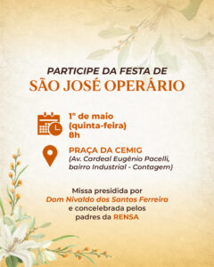 A Arquidiocese de Belo Horizonte convida fiéis para celebrarem a 49ª Missa do Trabalhador e da Trabalhadora, no Dia de São José Operário, 1º de maio, na Praça da Cemig, em Contagem, às 8 horas da manhã. A tradicional Celebração Eucarística será presidida pelo bispo auxiliar da Arquidiocese de Belo Horizonte, Dom Nivaldo dos Santos Ferreira, e concelebrada pelos padres das comunidades de fé da Região Episcopal Nossa Senhora Aparecida (Rensa).