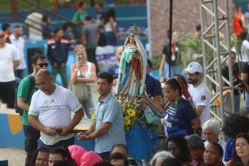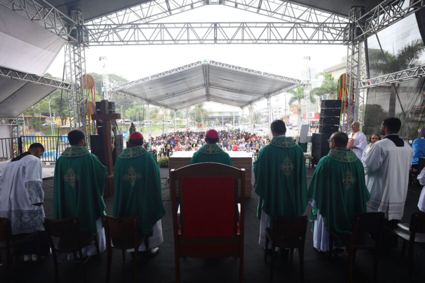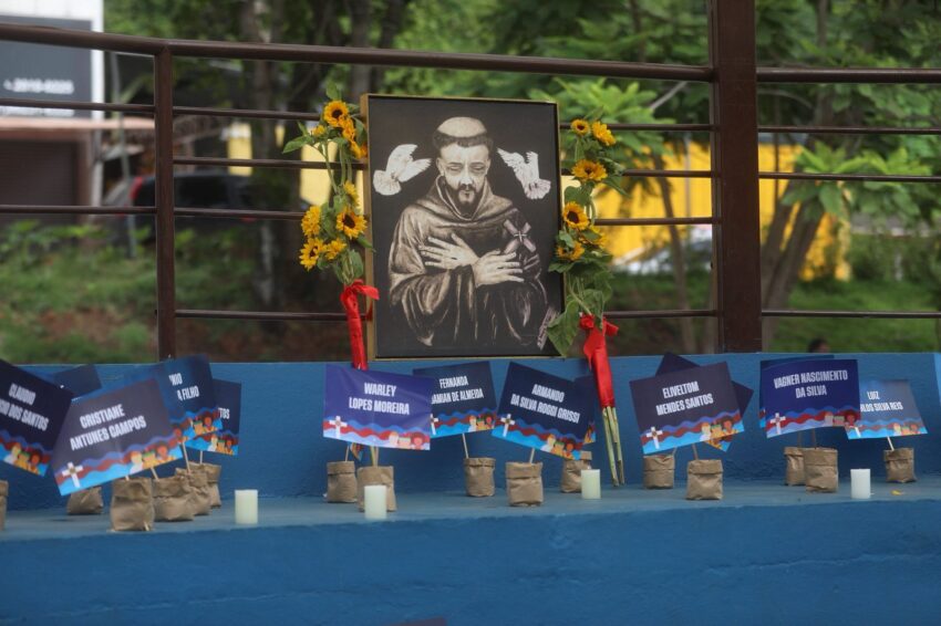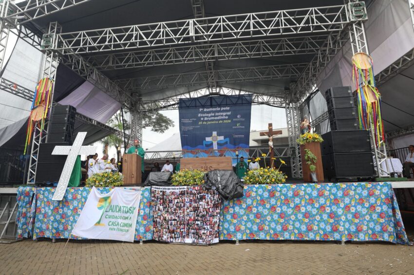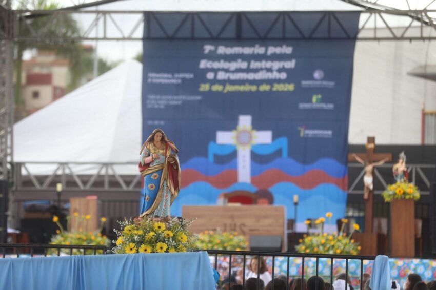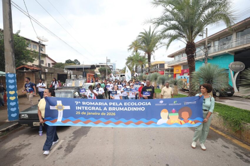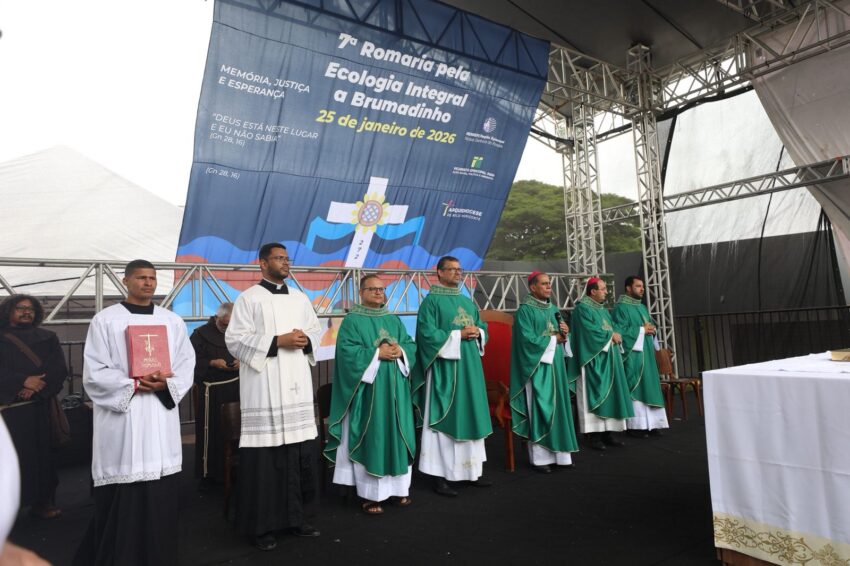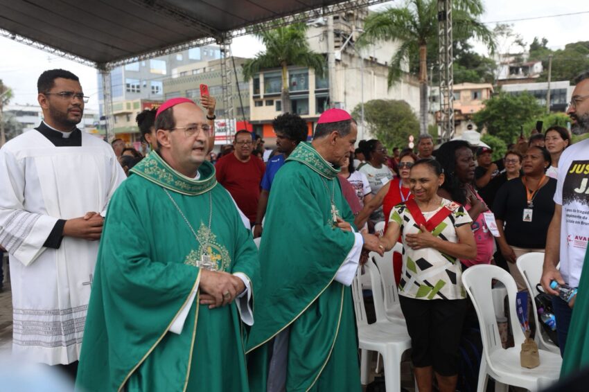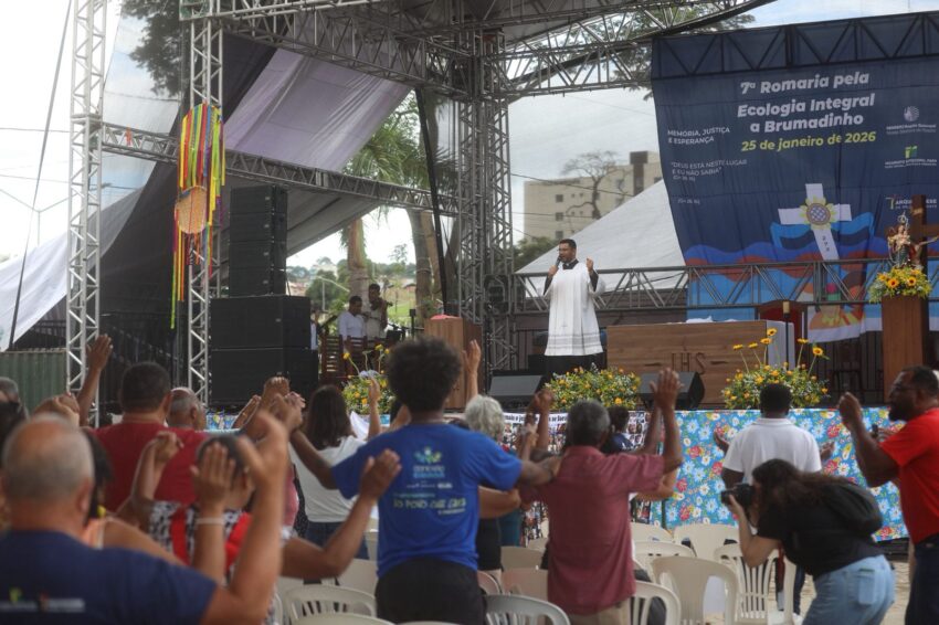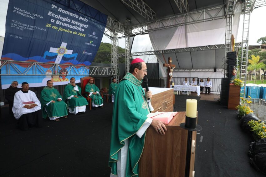 A Missa em memória às vítimas do rompimento da barragem com rejeitos de mineração que, em 2019, tirou a vida de 272 pessoas, iniciou a 7ª Romaria pela Ecologia Integral a Brumadinho, neste domingo, 25 de janeiro. Peregrinos das comunidades de fé da Cidade, de paróquias de outros municípios mineiros, familiares das vítimas, cidadãos de muitos lugares, se uniram em oração na Praça Orides Parreiras, onde a Missa campal foi celebrada, com a presidência de dom Joel Maria dos Santos, bispo auxiliar da Arquidiocese de Belo Horizonte, e concelebrada por dom Francisco Cota, bispo diocesano de Sete Lagoas, presidente da Comissão Episcopal para a Ecologia Integral e Mineração do Regional Leste 2 da Conferência Nacional dos Bispos do Brasil (CNBB Leste 2). Antes, foram partilhadas 272 mudas de plantas diversas, referência às 272 pessoas que perderam a vida com o rompimento da barragem, em 2019 – uma tragédia que trouxe ainda graves impactos socioambientais às comunidades próximas ao Rio Paraopeba, contaminado com rejeitos de mineração.