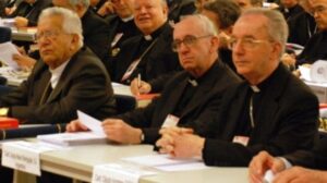 Ao centro, o então arcebispo de Buenos Aires, Jorge Mario Bergoglio, na Conferência de Aparecida, em maio de 2007