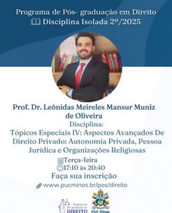 O curso de pós graduação em Direito (Mestrado e Doutorado) da PUC Minas oferece a disciplina isolada Tópicos especiais IV: Aspectos avançados de Direito Privado: Autonomia Privada, Pessoa Jurídica e Organizações Religiosas. A disciplina traz uma proposta transdisciplinar e envolve o estudo do Acordo Brasil Santa Sé. Clique aqui para fazer a sua inscrição.