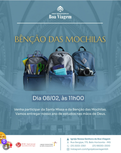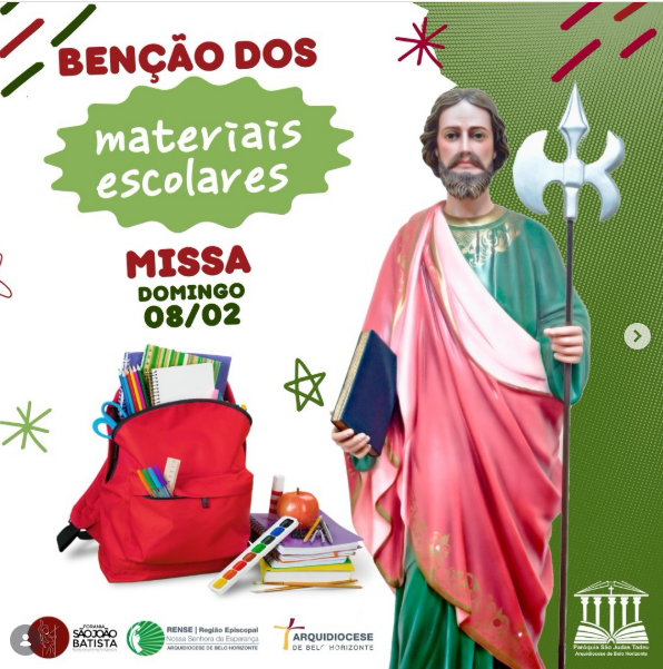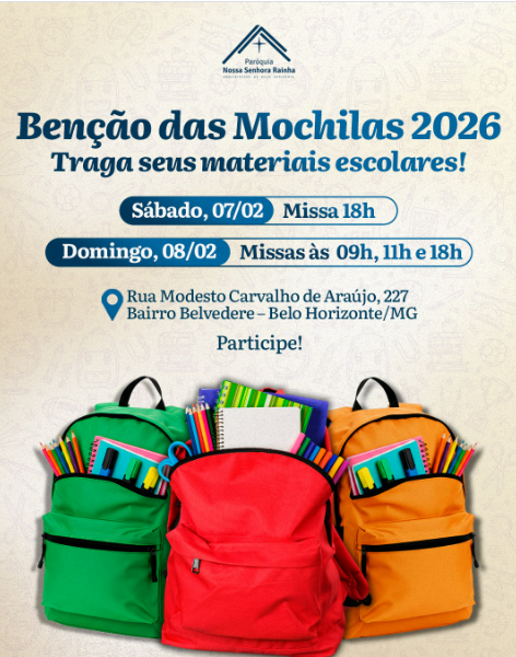 Olhai com especial carinho para estes estudantes e para todos os profissionais da educação. Concedei-lhes a vossa sabedoria, para que compreendam que, embora cada um possua um brilho próprio, é somente na união de nossos esforços e na comunhão de nossos corações que conseguiremos iluminar o mundo e desenhar novos mapas de esperança. Abençoai também estes materiais escolares (mochilas, livros e instrumentos de estudo). Que eles não sejam apenas objetos, mas sinais da vossa proteção e do esforço diário de quem busca a verdade. Que, ao utilizá-los, cada aluno e educador sinta que a vossa mão guia seus passos e fortalece sua caminhada. Fazei com que esta comunidade educativa, vivendo a fraternidade e o serviço, brilhe diante dos homens por meio de boas obras, para que o mundo reconheça a vossa presença. Por Cristo, nosso Senhor.