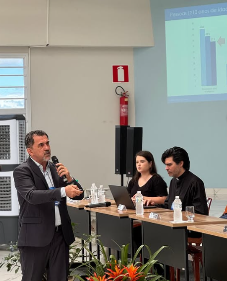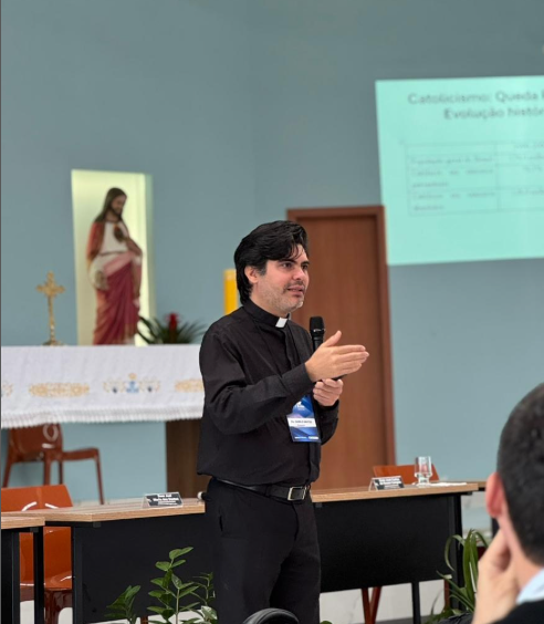 Durante a exposição, o padre Danilo apresentou um estudo sobre o impacto na religião na sociedade.