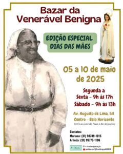 A Associação dos Amigos da Irmã Benigna (Amaiben) promove o Bazar da Venerável Benigna – edição especial Dia das Mães – de 5 a 10 de maio, de segunda a sexta das 9h às 17h e neste sábado, das 9h às 13h, na avenida Augusto de Lima, 511, Centro, BH.