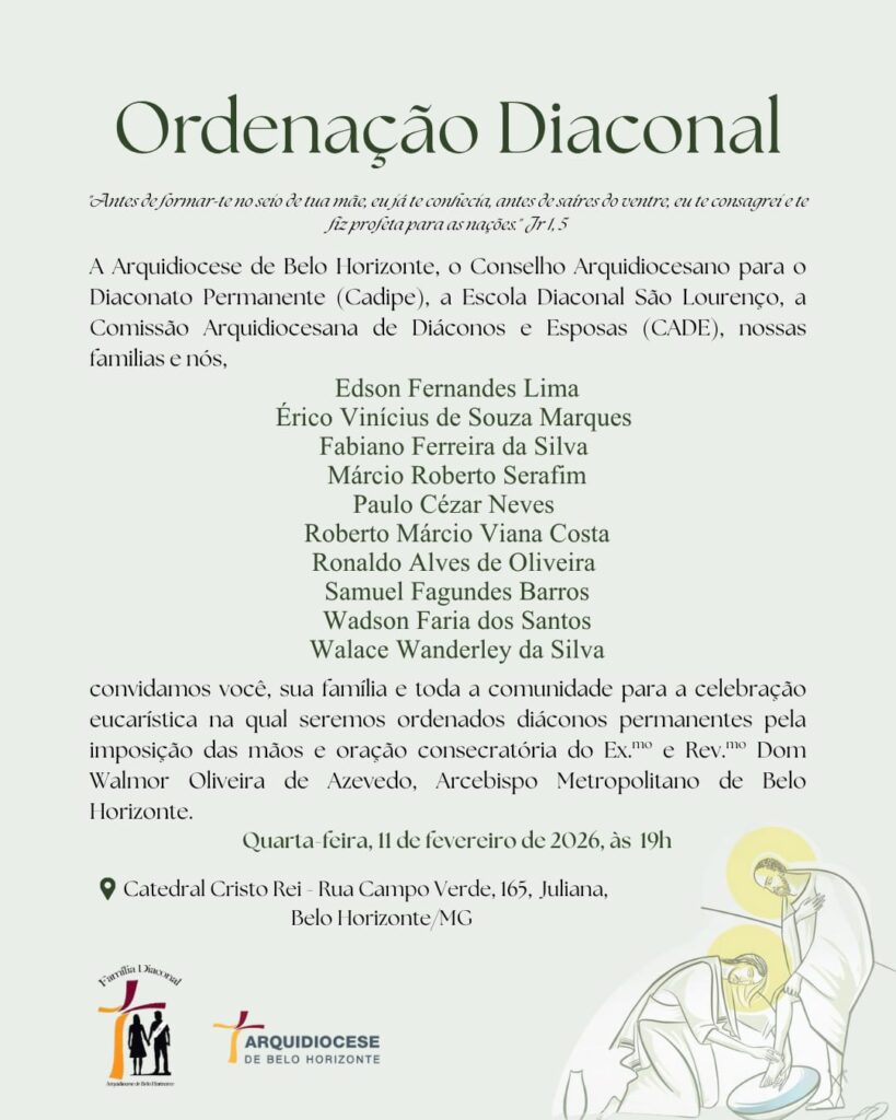 A Arquidiocese de Belo Horizonte, o Conselho Arquidiocesano para o Diaconato Permanente, a Escola Diaconal São Lourenço e a Comissão Arquidiocesana de Diáconos e Esposas convidam fiéis e comunidades de fé para a Ordenação Diaconal, dia 11 de fevereiro, quarta-feira, às 19h, na Catedral Cristo Rei – Igreja-Mãe da nossa Arquidiocese.