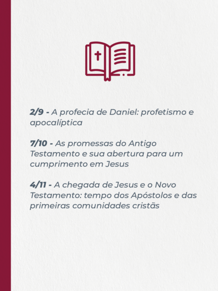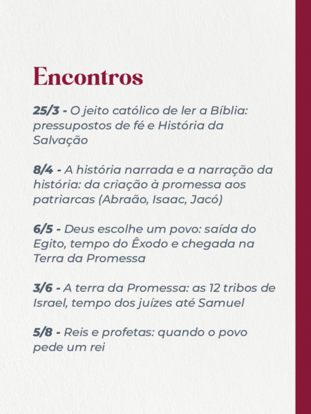 - 25/3 – O jeito católico de ler a Bíblia: pressupostos de fé e História da Salvação;