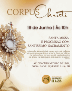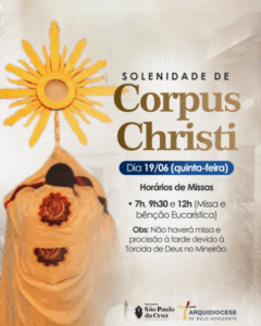 No dia 19 de junho – Festa de Corpus Christi – após a Celebração Eucarística das 11h, fiéis seguem em procissão no entorno da Igreja. Em seguida, a comunidade de fé é convidada a celebrar, em comunhão, o Santíssimo Sacramento do Corpo e do Sangue de Cristo na Torcida de Deus, rezando juntos na Santa Missa presidia por dom Walmor Oliveira de Azevedo, às 17h15, no estádio Mineirão.