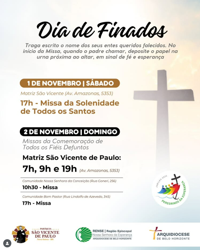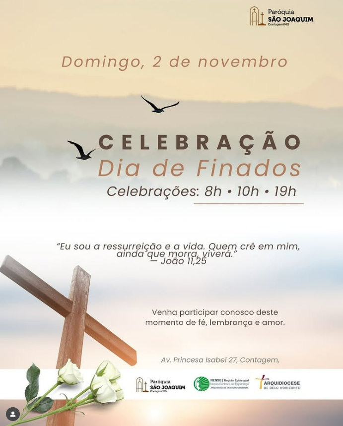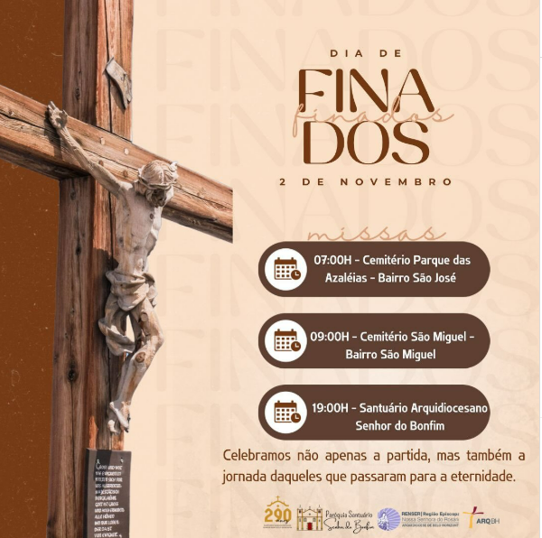 No Dia de Finados – domingo, 2 de novembro, as comunidades de fé da Arquidiocese de Belo Horizonte se reúnem para rezar por aqueles que já foram chamados pelo Pai. Missas, oração do Terço, Laudes e Vésperas serão celebradas durante todo o dia em homenagem aos entes queridos já falecidos. A programação será vivenciada em cemitérios, santuários e paróquias da Arquidiocese de Belo Horizonte. Na Catedral Cristo Rei – nossa Igreja-Mãe, a celebração de finados será às 8h, às 10h30 e às 15h30.