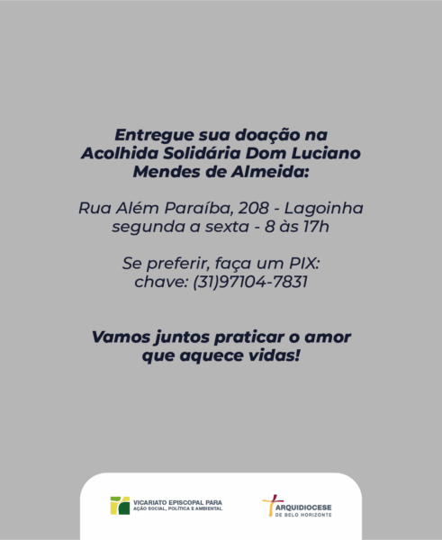 A Acolhida Solidária Dom Luciano Mendes de Almeida, da Arquidiocese de Belo Horizonte, reforça o pedido de doações para ajudar aqueles que enfrentam o frio. A campanha solidária, que busca reunir agasalhos, cobertores e toucas é realizada todos os anos com o objetivo de amparar os que vivem nas ruas ou não têm condições de se proteger do frio. Em média, aproximadamente 120 pessoas, por semana, recorrem à Acolhida Solidária da Arquidiocese de Belo Horizonte com pedidos de doação.