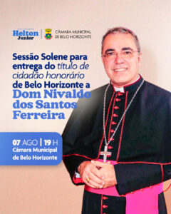 Dom Nivaldo dos Santos Ferreira será agraciado com título de cidadão honorário de Belo Horizonte, em reconhecimento ao dedicado trabalho pastoral junto ao povo de Deus da nossa Arquidiocese. O título de cidadão honorário, iniciativa do vereador Helton Junior (PSD), será entregue no dia 7 de agosto, às 19h, na Câmara Municipal de Belo Horizonte.