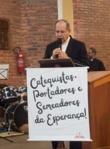 Durante o encerramento do jubileu de catequistas da Região Episcopal Nossa Senhora da Boa Viagem (Rensb), realizado no Santuário Arquidiocesano Santo Antônio (Roça Grande), dom Walmor falou aos catequistas recordando a todos sobre a importância da missão que, nas palavras do arcebispo, é um tesouro oferecido a crianças e jovens, que vivenciam as belezas do progresso mas, ao mesmo tempo, enfrentam o distanciamento humano. “Há muitos que estão com fome e com sede pois não há quem os ofereça o tesouro da fé católica.”
