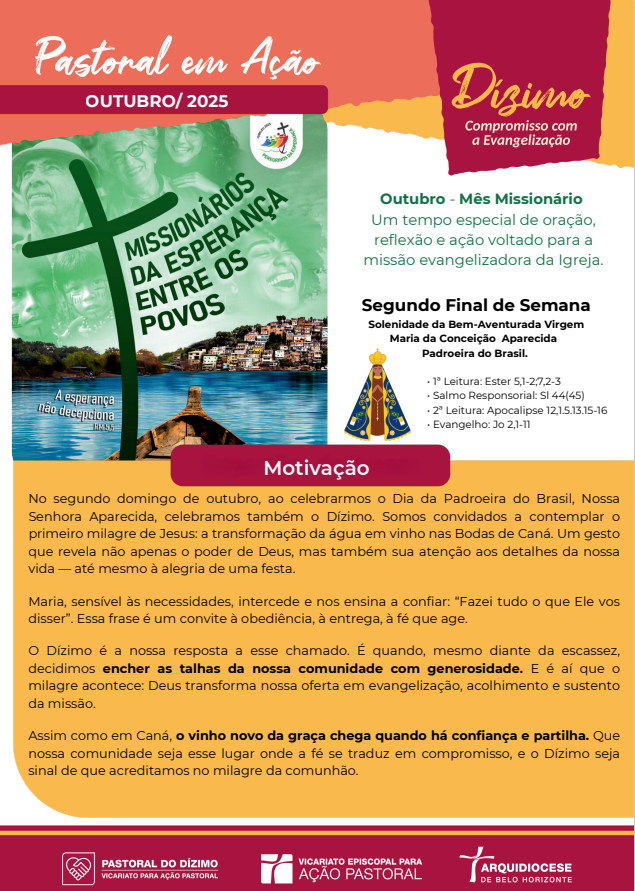 A edição deste mês nos convida a celebrar o Dia da Padroeira do Brasil, Nossa Senhora Aparecida, e também a contemplar o primeiro milagre de Jesus: a transformação da água em vinho nas Bodas de Caná. Além disso, a publicação também inclui sugestões de preces e dicas criativas que envolvem a participação dos dizimistas, crianças e fiéis.