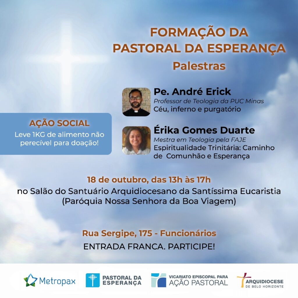 O padre André Erick, professor de Teologia da PUC Minas, e Érika Gomes Duarte, mestra em Teologia, conduzirão o encontro. A programação inclui reflexões sobre os temas: “Céu, inferno e purgatório” e “Espiritualidade Trinitária: Caminho de comunhão e esperança”.