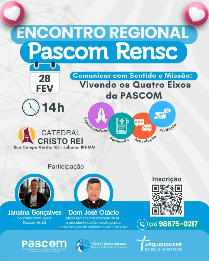 O momento de espiritualidade e formação será inspirado pelo tema “Comunicar com Sentido e Missão: Vivendo os Quatro Eixos da Pascom” e contará com as reflexões de dom José Otacio, bispo auxiliar da Arquidiocese de Belo Horizonte e presidente da Comissão de Comunicação da CNBB Leste 2, também com a assessoria de Janaína Gonçalves, coordenadora-geral da Pascom Brasil.