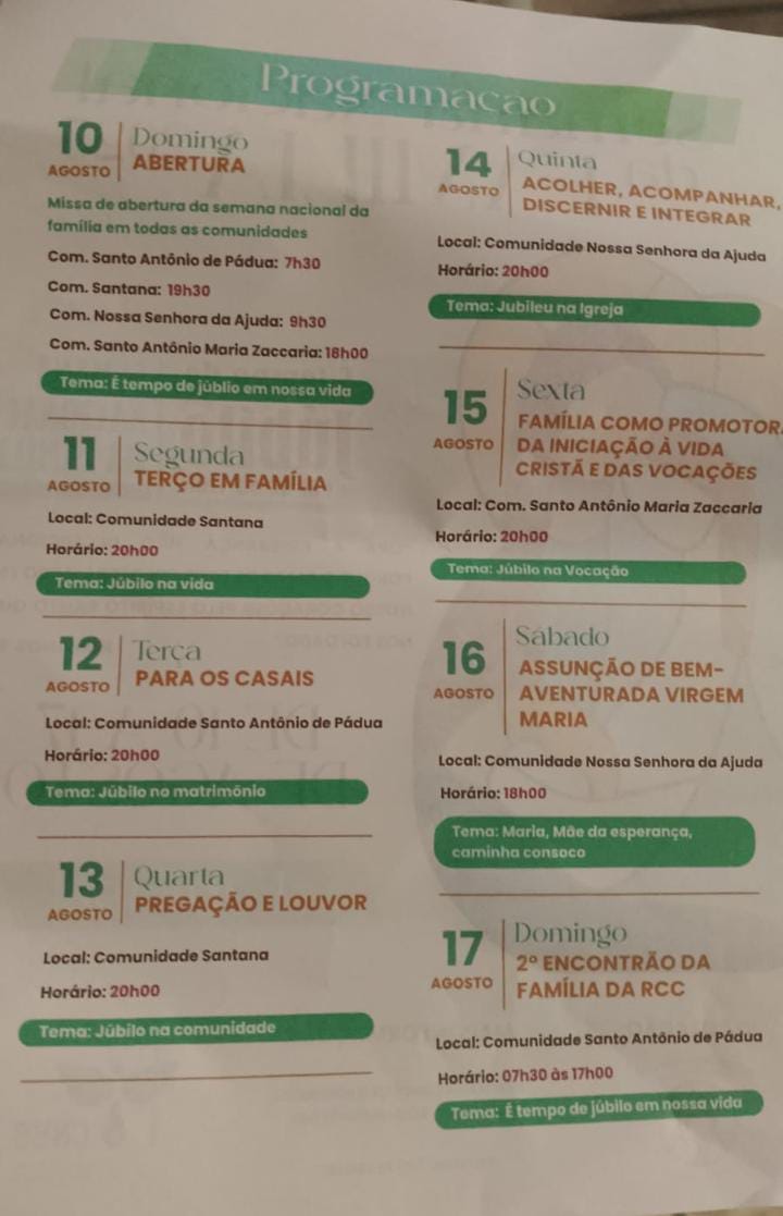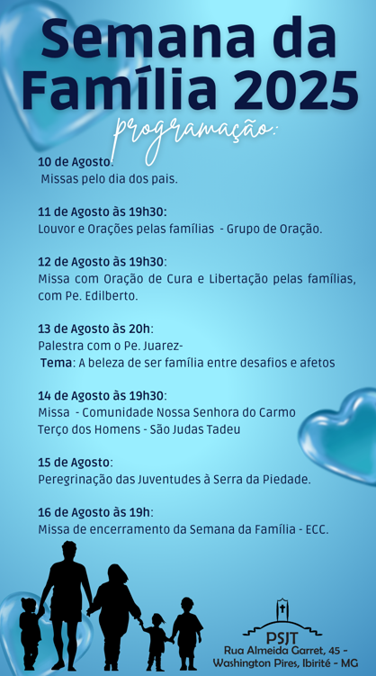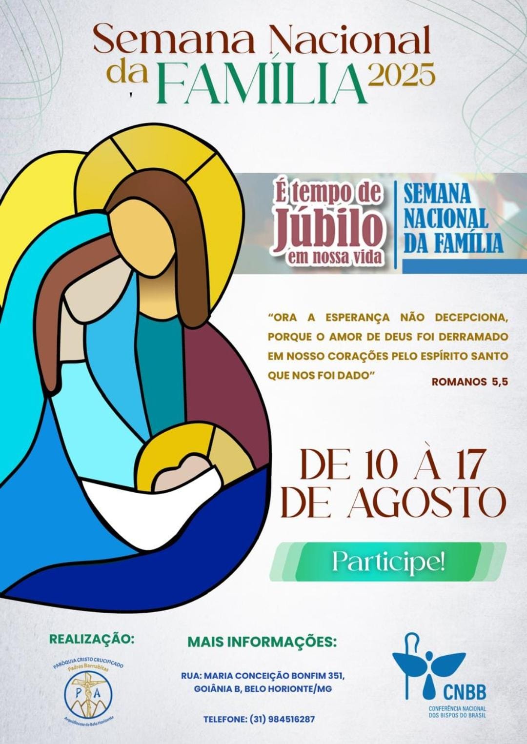 Em comunhão com o Ano Jubilar, a Igreja celebra, de 10 a 16 de agosto, a Semana da Família. O tema escolhido, “É tempo de Júbilo em nossa vida”, e o lema “Ora, a esperança não decepciona, porque o amor de Deus foi derramado em nossos corações pelo Espírito Santo que nos foi dado” (Rm 5,5) — inspiram este momento especial de fé, unidade e renovação para as famílias.