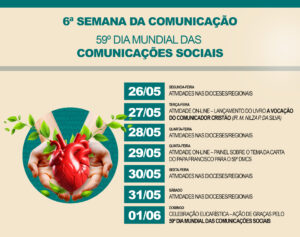 A Pascom Brasil convida pasconeiros e pasconeiras para a especial programação da 6ª Semana de Comunicação, que será celebrada de 26 de maio a 1 de junho de 2025, nas Dioceses e Arquidioceses de todo o Brasil. Clique aqui e confira o Subsídio para 59º Dia Mundial das Comunicações Sociais