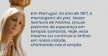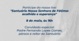 Neste bate-papo especial, no dia 8 de maio,quinta-feira, às 16 horas, vamos refletir também como a mensagem de paz e de esperança de Nossa Senhora de Fátima pode ser vivida em nosso dia a dia e de que forma seu exemplo inspira as novas gerações. O nosso convidado especial é o padre Fernando Lopes Gomes, pároco e reitor do Santuário Arquidiocesano Nossa Senhora de Fátima.