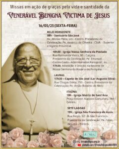 Amigos e devotos da Venerável Irmã Benigna convidam para Missas em Ação de Graças pela sua vida e santidade, neste mês de maio – especialmente dedicado à Maria. Na Arquidiocese de Belo Horizonte, as Missas serão celebradas, nesta sexta-feira, dia 16 de maio, às 8h, no Santuário Arquidiocesano São José (Centro – BH), e também na Igreja Nossa Senhora da Piedade, bairro Caiçara, às 18h30. Participe conosco!?