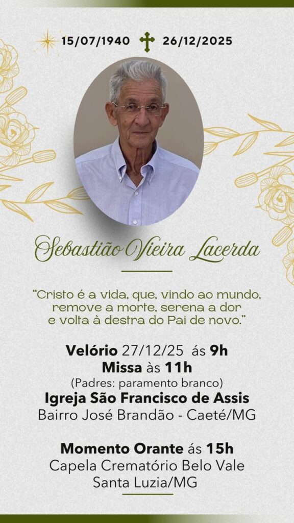 O velório do Senhor Sebastião será neste sábado, dia 27, na Igreja São Francisco de Assis (Av. Padre Vicente Cornélio Borges, n° 6 , José Brandão, Caeté), a partir das 9h. Às 11h fiéis se unem para a Missa Exequial.