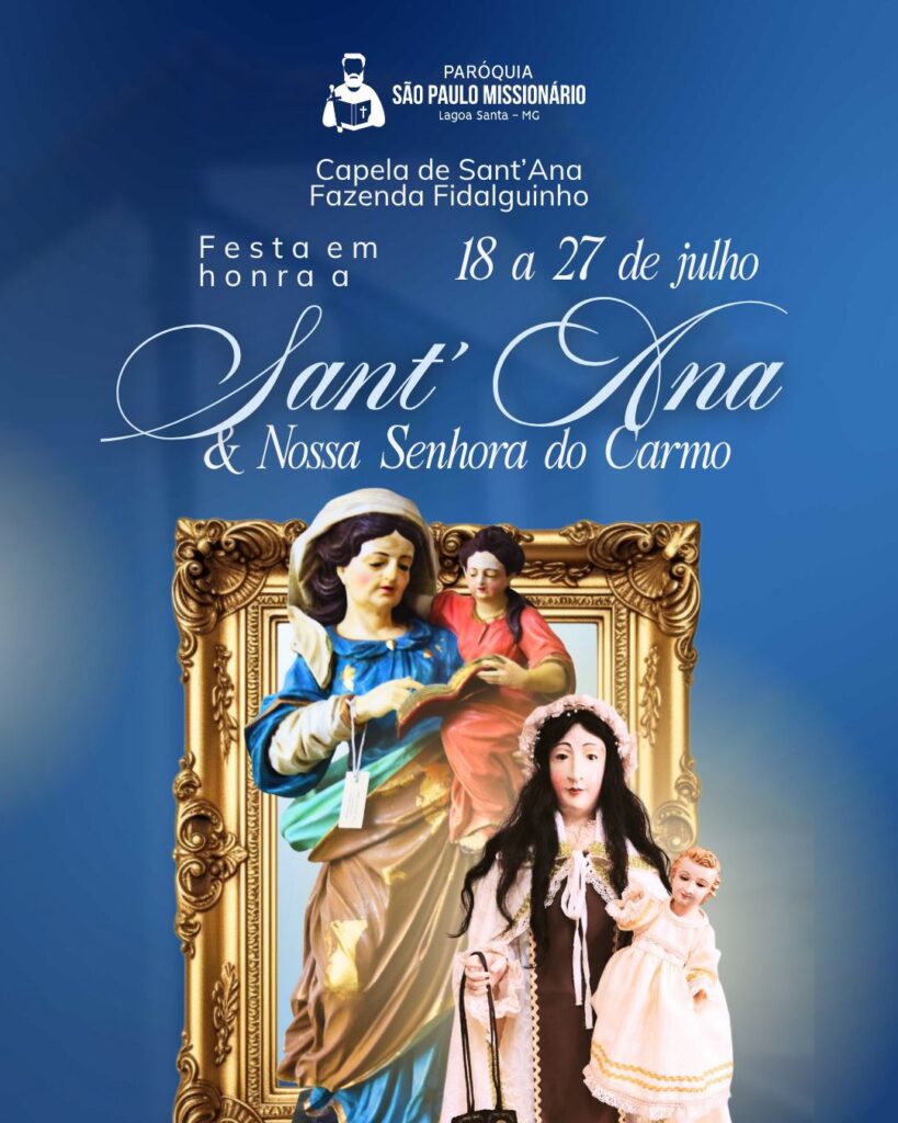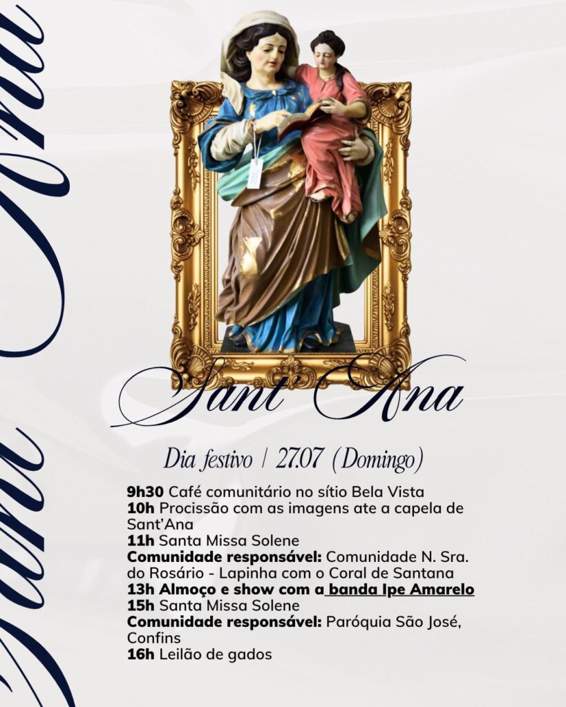 A Paróquia São Gonçalo, em Belo Vale, convida fiéis e devotos para a Novena e Festa de Sant’Ana, Padroeira da cidade, de 17 a 27 de julho. Especial momento de fé, oração, louvor e comunhão para toda família.