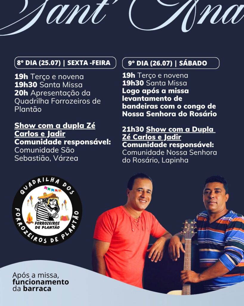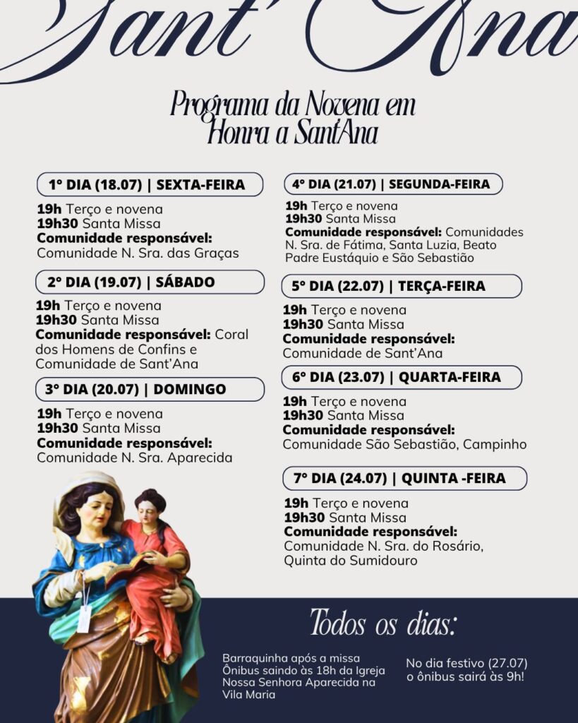 A programação inclui Adoração, Oração do Terço, Santa Missa e quermesse diariamente. Já no fim de semana, Festa de Sant’Ana, fiéis são convidados para as Missas, às 7h, 10 e 15h. Após a Celebração, haverá procissão com as imagens da Padroeira, São Joaquim e São José.