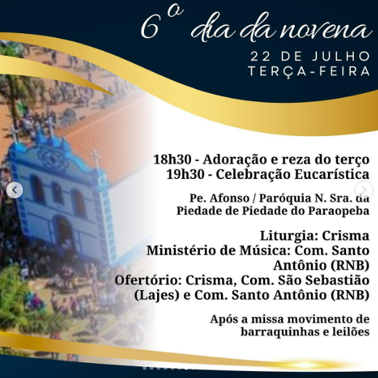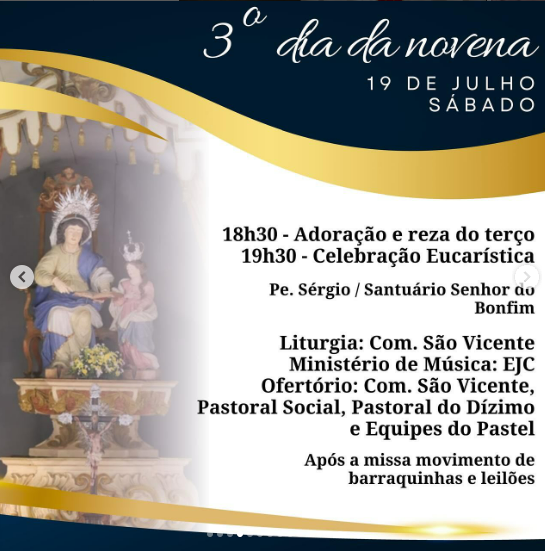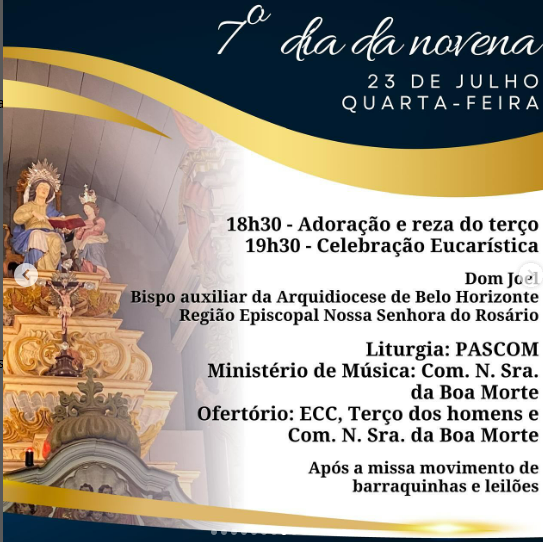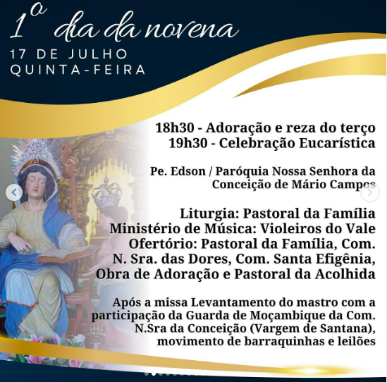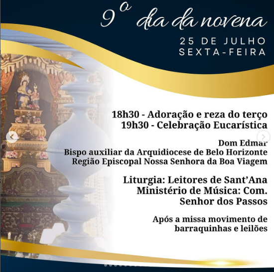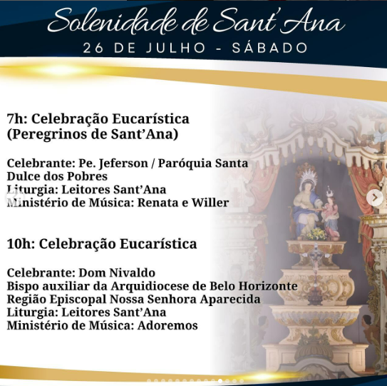 A Paróquia São Gonçalo, em Belo Vale, convida fiéis e devotos para a Novena e Festa de Sant’Ana, Padroeira da cidade, de 17 a 27 de julho. Especial momento de fé, oração, louvor e comunhão para toda família.