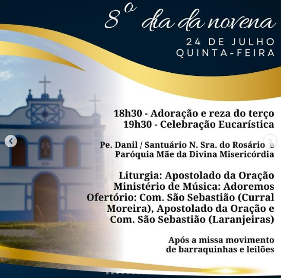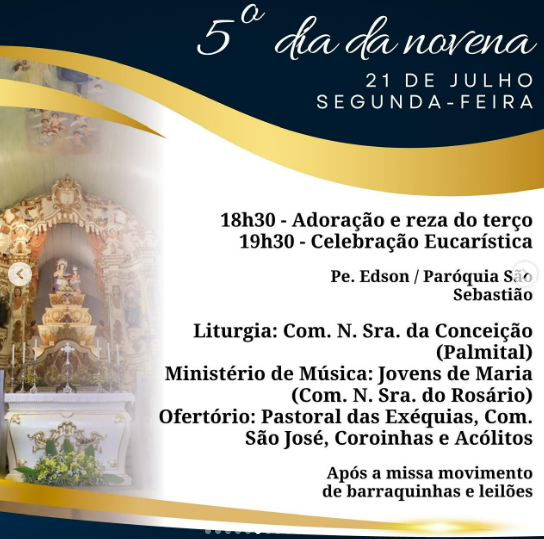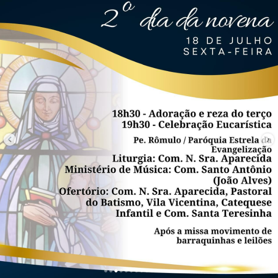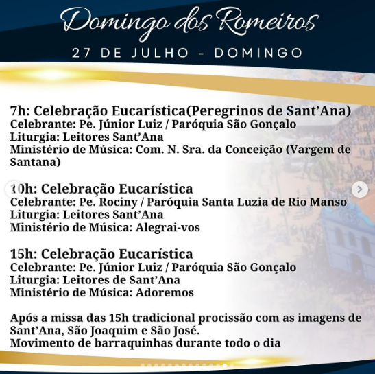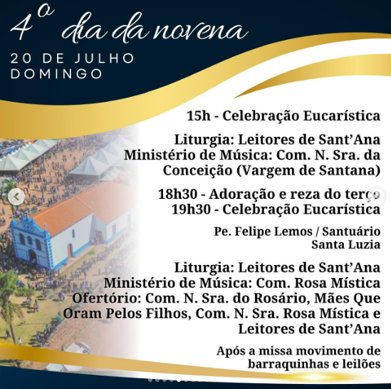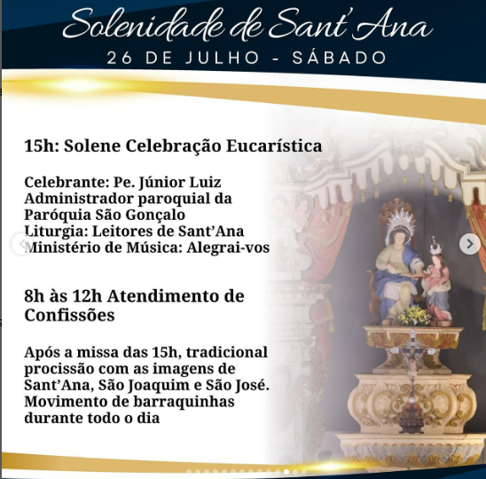 A programação inclui Adoração, Oração do Terço, Santa Missa e quermesse diariamente. Já no fim de semana, Festa de Sant’Ana, fiéis são convidados para as Missas, às 7h, 10 e 15h. Após a Celebração, haverá procissão com as imagens da Padroeira, São Joaquim e São José.