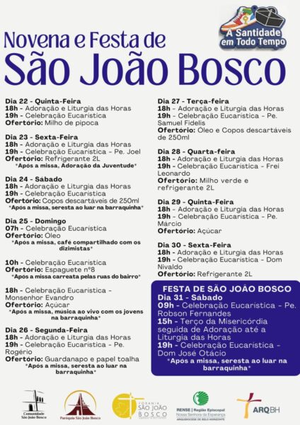 A Paróquia São João Bosco convida fiéis para a Novena e Festa em honra do seu padroeiro, de 22 a 31 de janeiro, no bairro Dom Bosco, em Belo Horizonte.