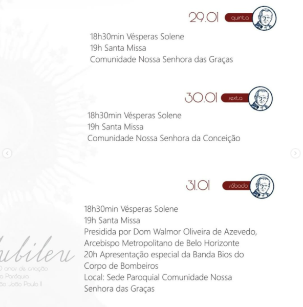 Fiéis e devotos são especiais convidados para celebrarem o Jubileu de 10 anos da criação e bonita caminhada evangelizadora da Paróquia São João Paulo II, em Caeté. A Festa ocorre de 24 a 31 de janeiro.