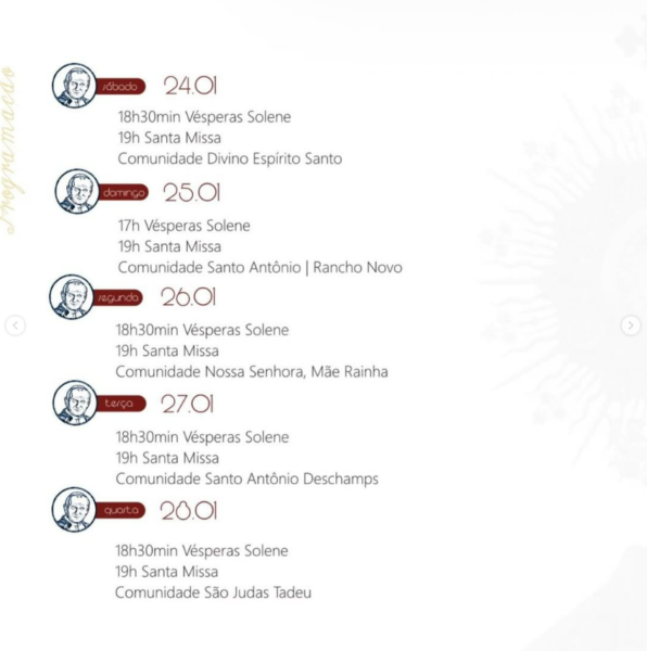 A programação do Jubileu traz Oração das Vésperas Solenes e Santa Missa celebradas nas comunidades de fé da paróquia. No dia 31 de janeiro, nosso arcebispo dom Walmor Oliveira de Azevedo preside Celebração Eucarística, às 19h. Logo depois, haverá apresentação musical da banda do Corpo de Bombeiros.