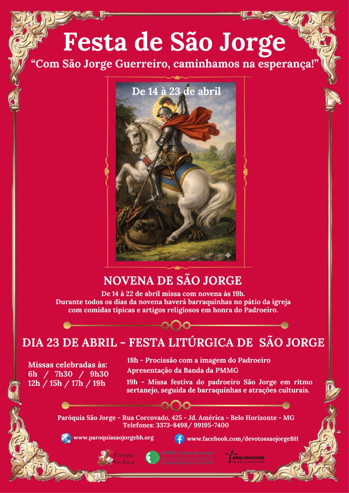 A Paróquia São Jorge se prepara para celebrar a Festa do Padroeiro, no bairro Jardim América, em Belo Horizonte. Entre os dias 14 e 23 de abril, a programação reúne momentos de oração e devoção, com Novenas, Procissões e Celebrações Eucarísticas.