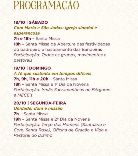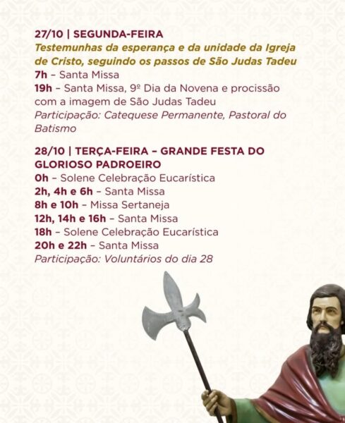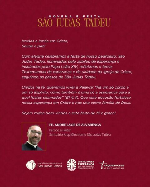 O Santuário Arquidiocesano São Judas Tadeu, unido em alegria e fé aos fiéis, peregrinos, romeiros e visitantes celebra a Festa do seu Padroeiro, de 18 a 28 de outubro.