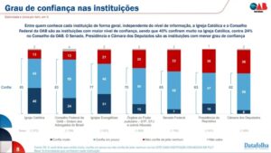 A Igreja Católica tem a confiança de 85% dos brasileiros, figurando como a primeira entre as instituições indicadas pelos brasileiros como mais confiável por pesquisa do Instituto Datafolha. O levantamento foi encomendado pelo Conselho Federal da Ordem dos Advogados do Brasil (OAB) e divulgado na última segunda-feira, 11 de agosto.