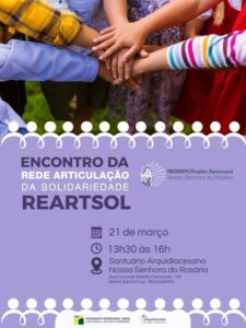 A Região Episcopal Nossa Senhora do Rosário (Renser) convida para o Encontro da Rede Articulação da Solidariedade – REARTSOL, agendado para 21 de março, das 13h30 às 16h, no Santuário Arquidiocesano Nossa Senhora do Rosário, em Brumadinho.
